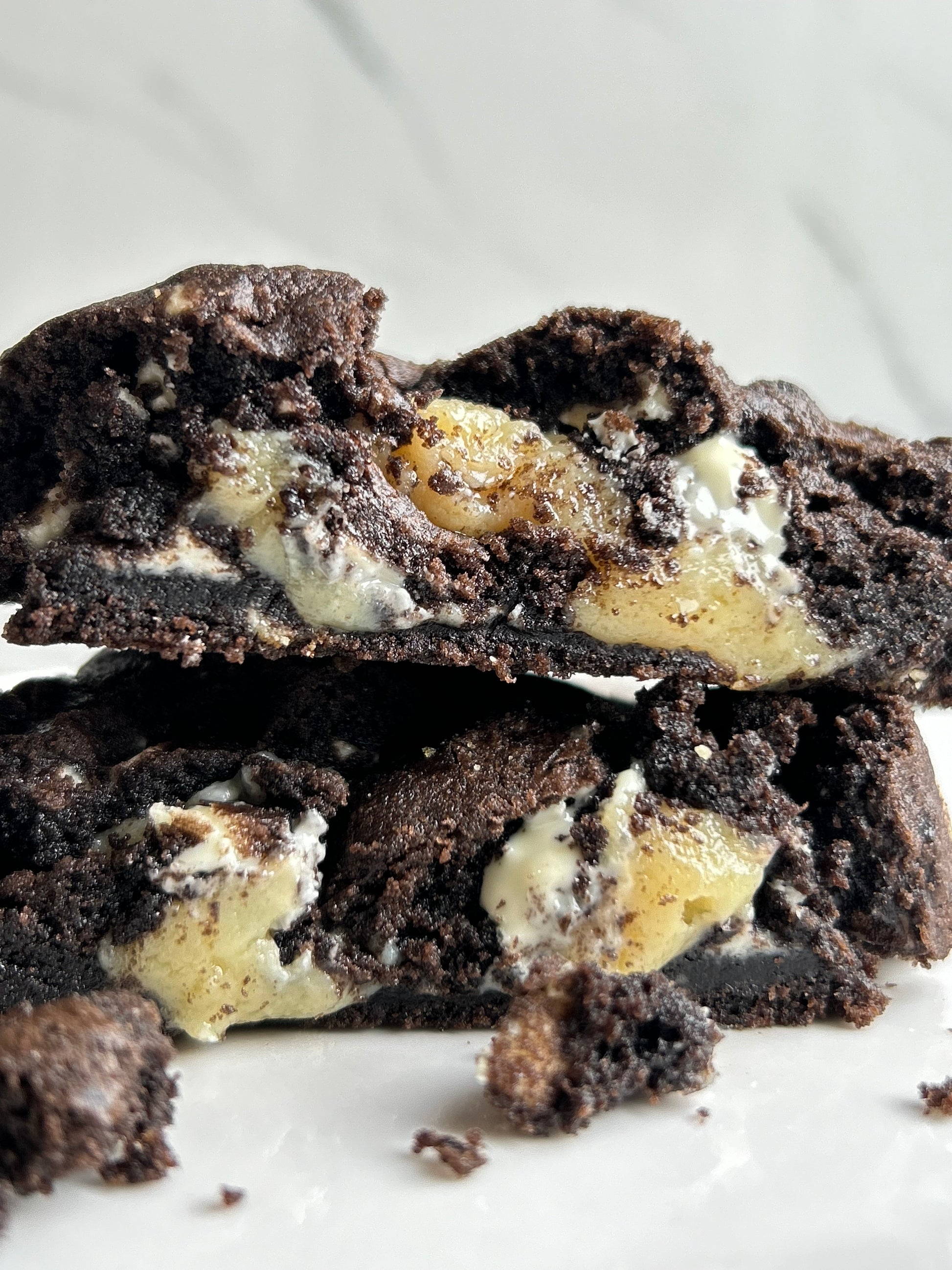 Cookie de chocolate dark con trozos de chocolate blanco + relleno cremoso de chocolate blanco.