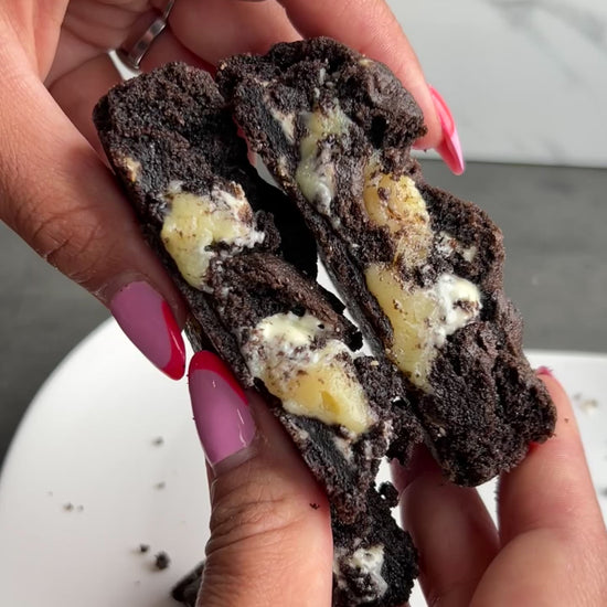 An intense and sophisticated cookie ⚫⚪. Dark chocolate dough 🍫 with chunks of white chocolate 🤍 for the perfect balance. At the center, a smooth and creamy white chocolate filling ✨ that turns every bite into a unique experience.